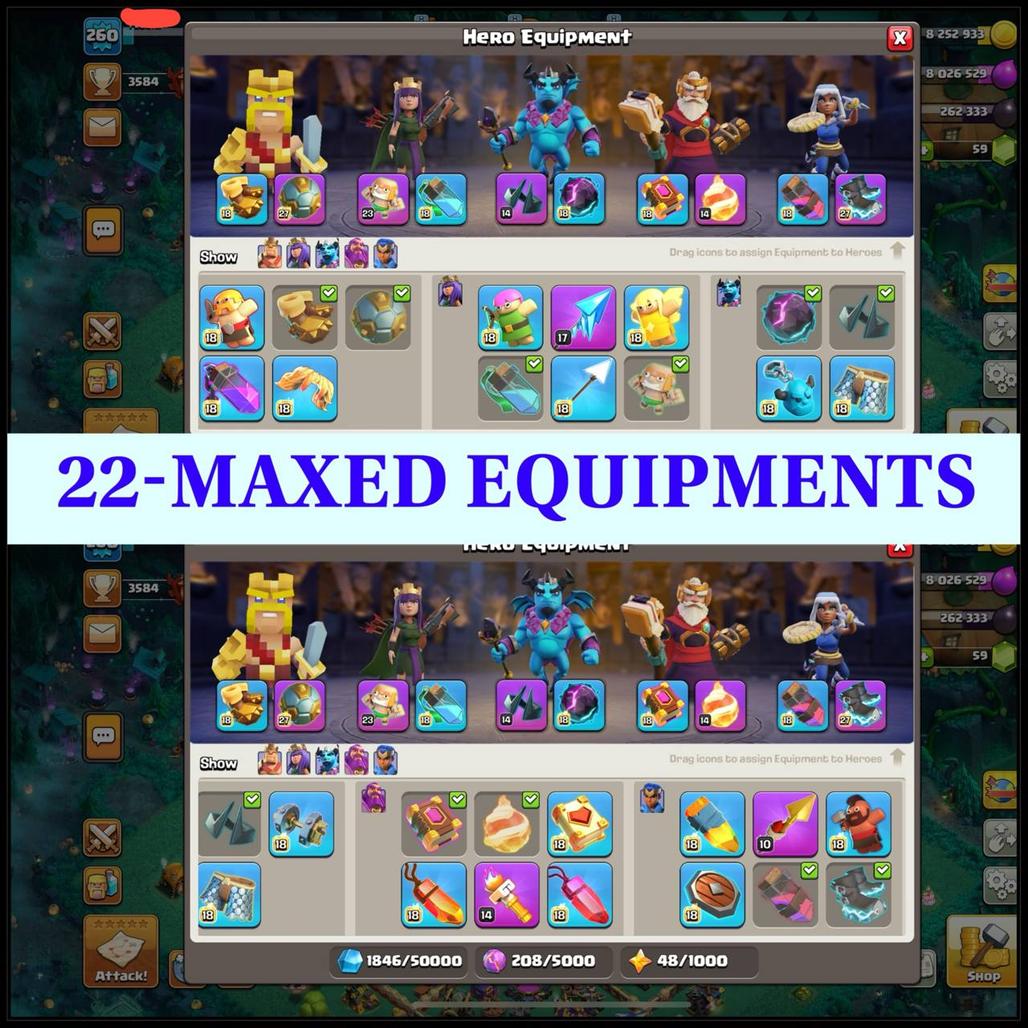 22 MAX EQUIPMENTSALMOST MAX TH-17 | MAX DEFENSE | ALL MAXED HEROES | XP LEVEL 260 | | 2687 WAR STAR-5663 ATB
