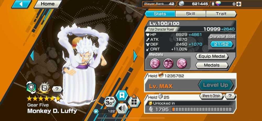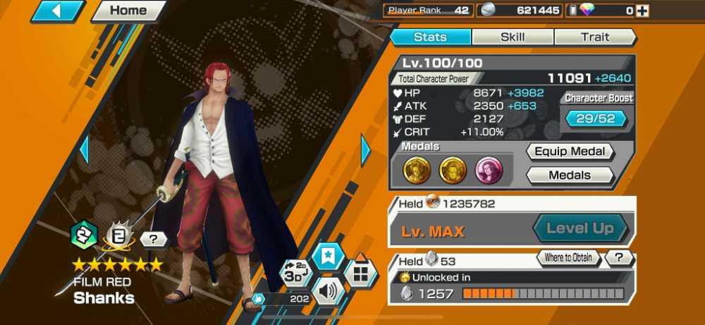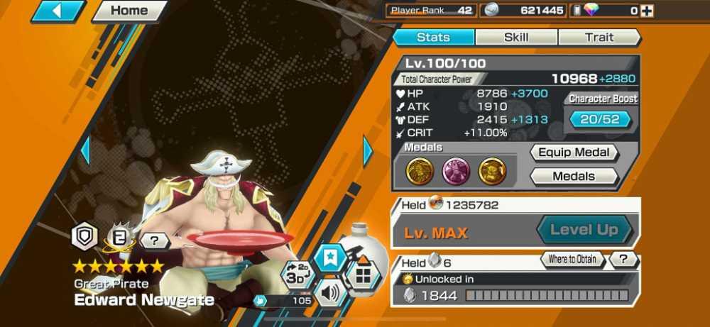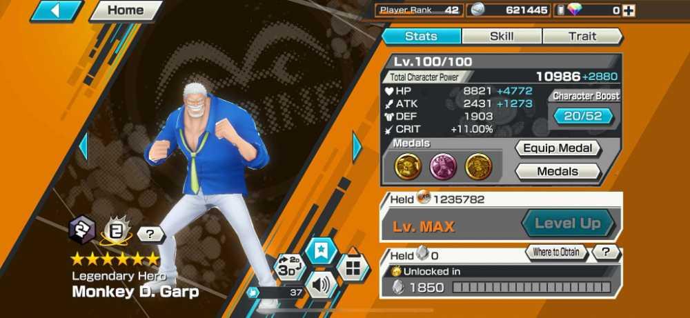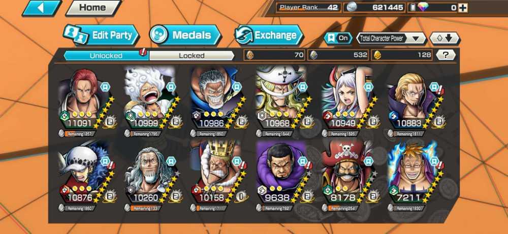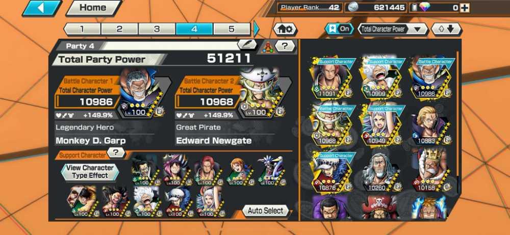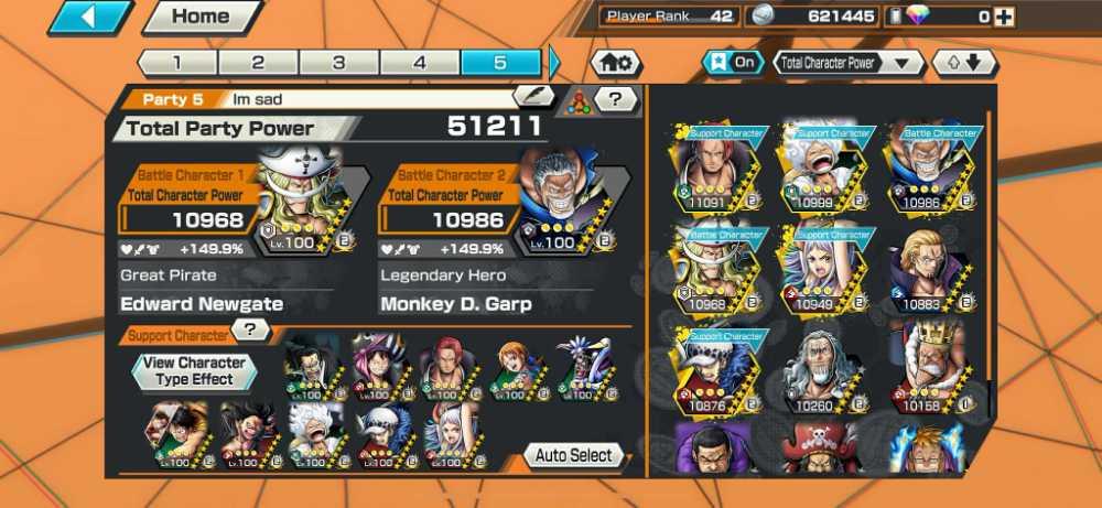 [3147] 6 EX - 5 MAX - Garp + Luffy G5 + Whitebeard + Yamato + Roger + Shanks , Support 150 , HB 8 , Good Medal
