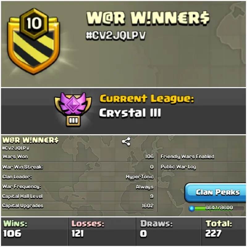 Level 10 || clan capital 9 || crystal 3 || name - WaR W!NNERS