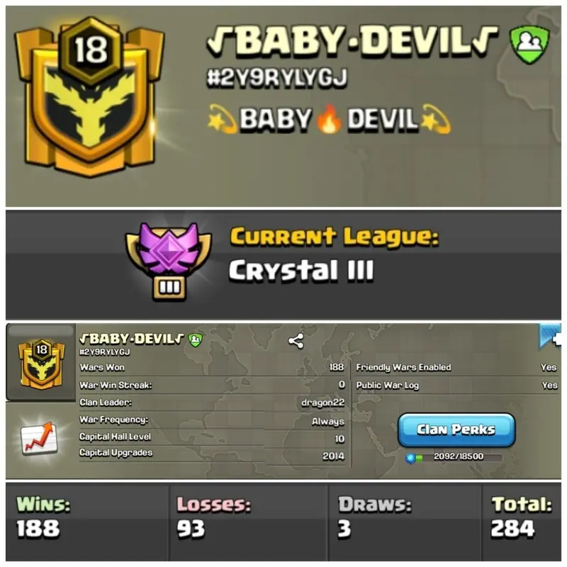 Discover this exceptional Level 18 Clan in Clash of Clans, primed for success under new leadership. Boasting a strong foundation with Clan Capital at Level 10, Crystal League 3 status, an impressive war log of 188-93, and the distinctive name √BABY-DEVIL√, it's an ideal opportunity for dedicated players seeking a competitive edge.