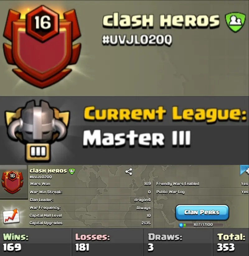 Join our thriving Level 16 clan, Clash Heros! With Clan Capital at level 10 and Master League 3 status, we're a dedicated community ready for epic battles and strategic growth. Whether you're a seasoned warrior or eager recruit, this is your chance to level up with a strong, active team.