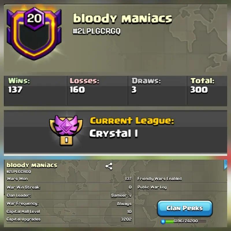 Name - bloody maniacs || level 20 clan || clan capital 10 || crystal 1