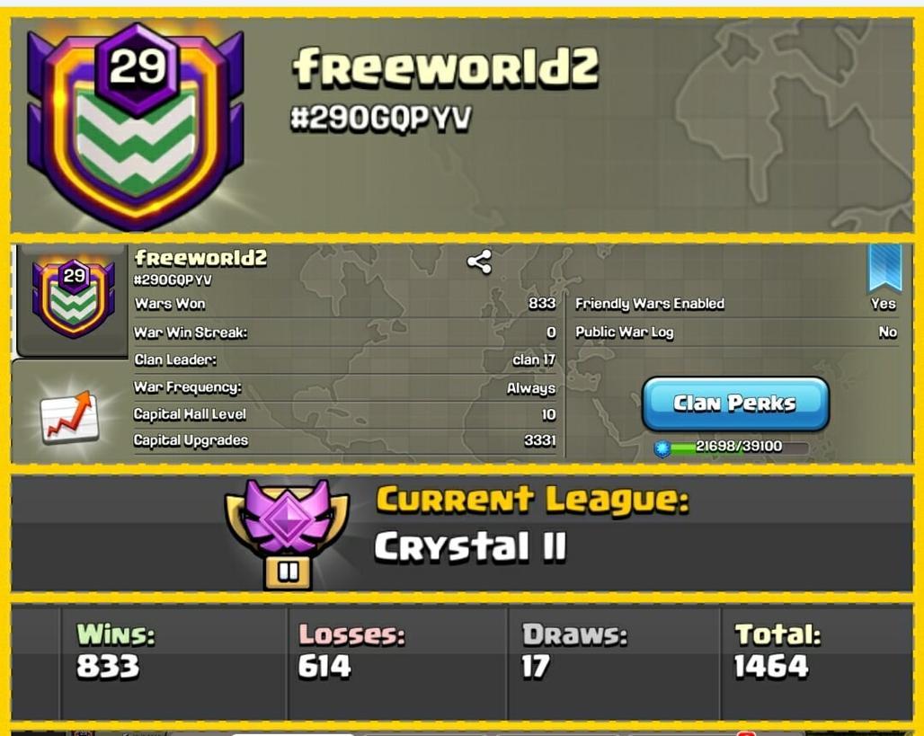 CLAN Level 28 | ENGLISH NAME CLAN : GOLDEN FAMILY | CLAN LEAGUE CRSYTAL 1 || CLAN CAPITAL 10 FULL MAX || POSITIVE WARLOG