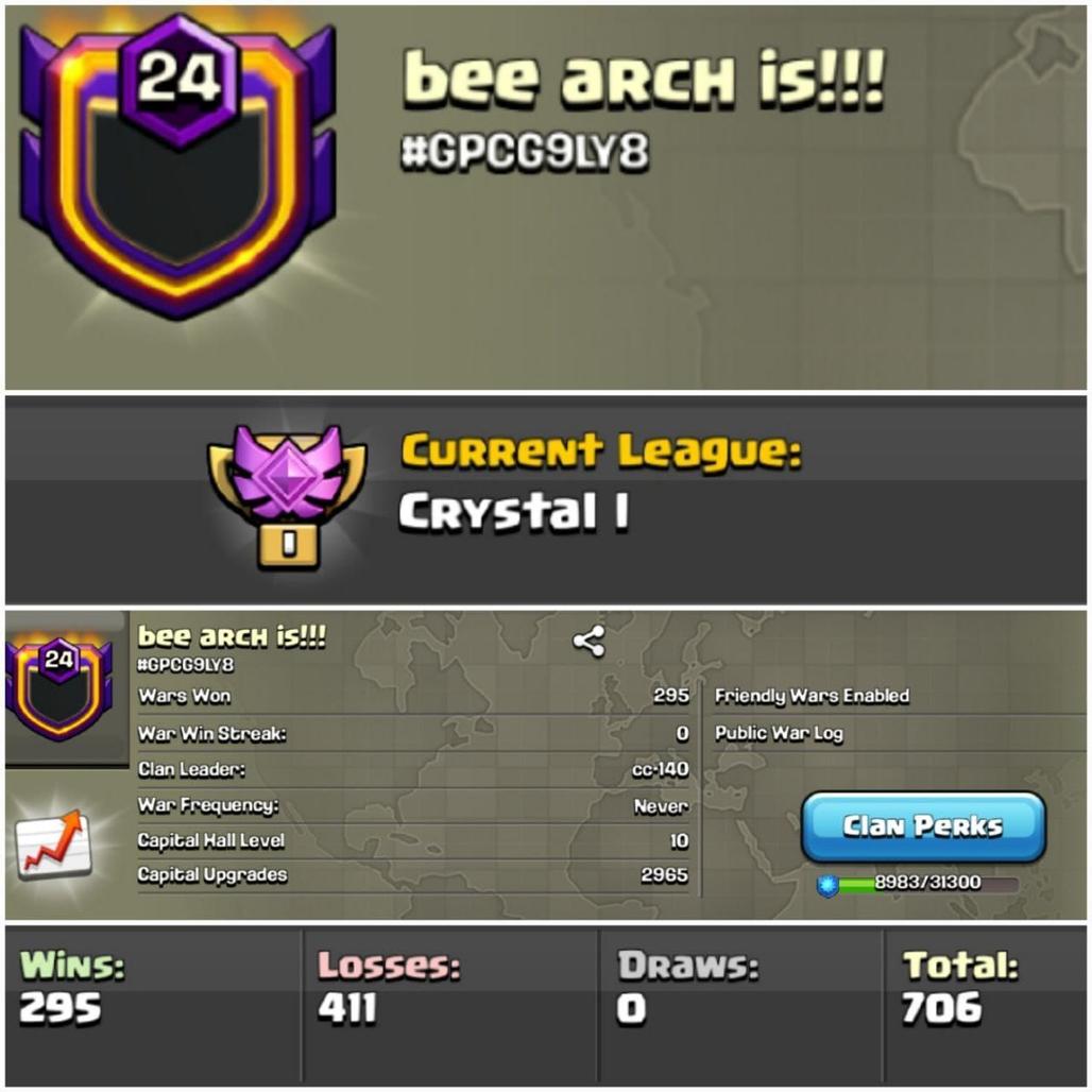 Level 24 clan || clan capital 10 || crystal 1 || name - bee arch is!!!