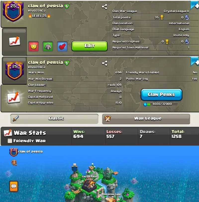 LEVEL 25 | NAME- CLAN OF PERSIA | POSITIVE WARLOG | CC8 | INSTANT DELIVERY