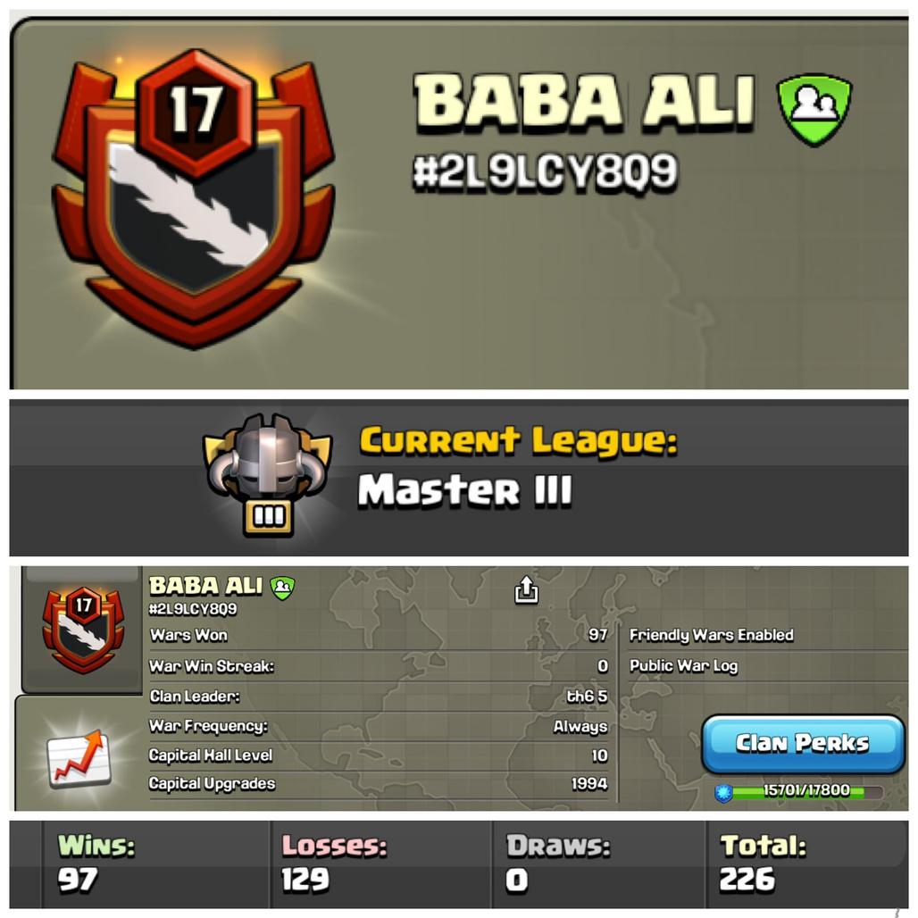 NAME- BABA ALI | LVL 17| WARLOG W-L-D:97-129-0 | CWL League: MASTER 3| CC: 10!!