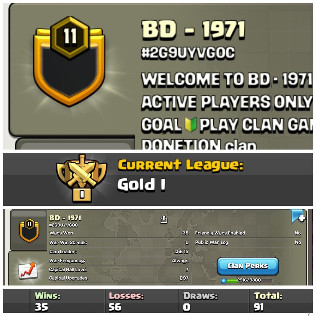 NAME- BD - 1971 | LVL 11| WARLOG W-L-D:35-56-0 | CWL League: GOLD 1| CC: 7!!