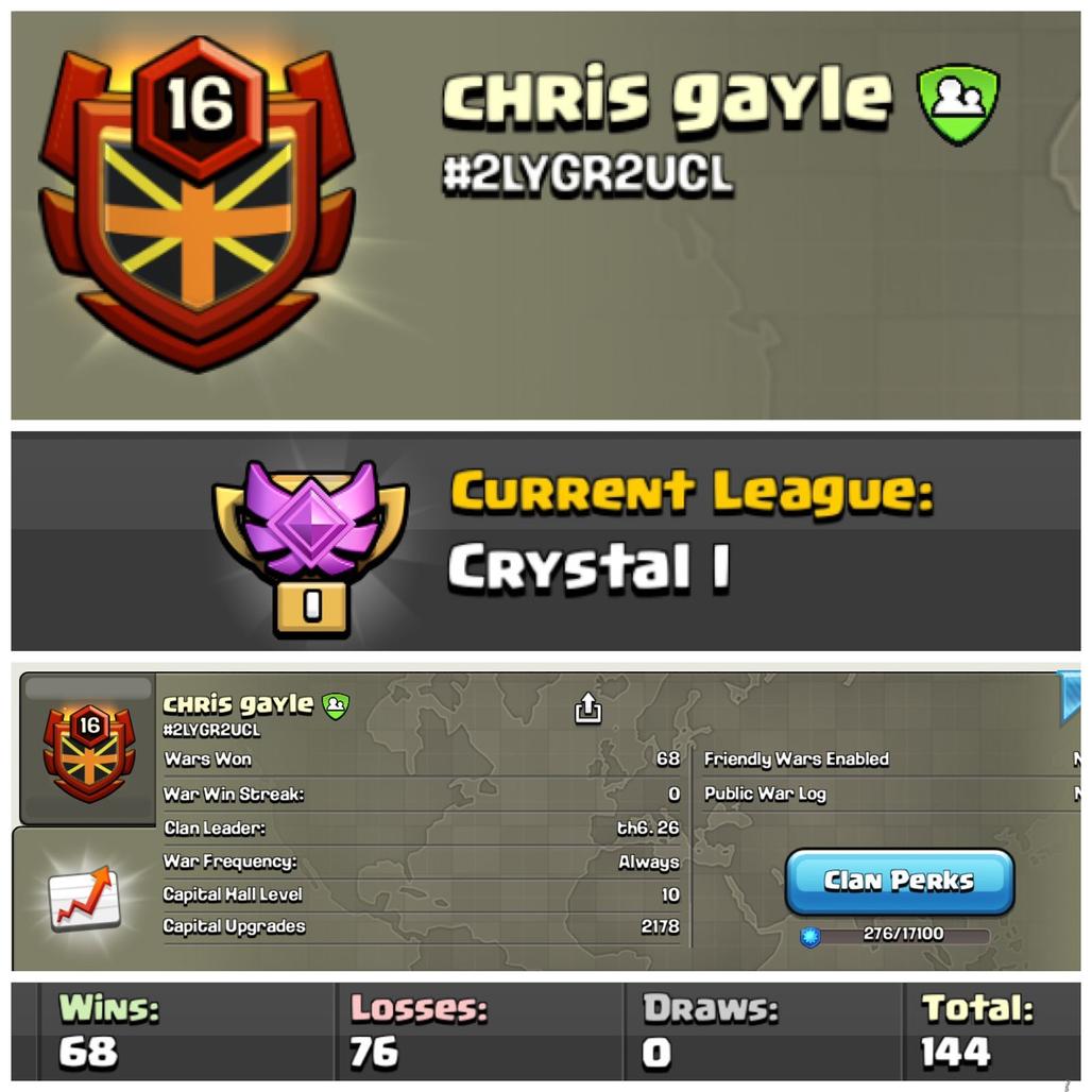 NAME- chris gayle | LVL 16| WARLOG W-L-D:68-76-0 | CWL League: CRYSTAL 1| CC: 10!!