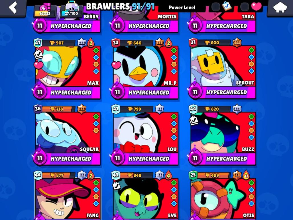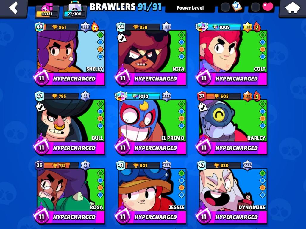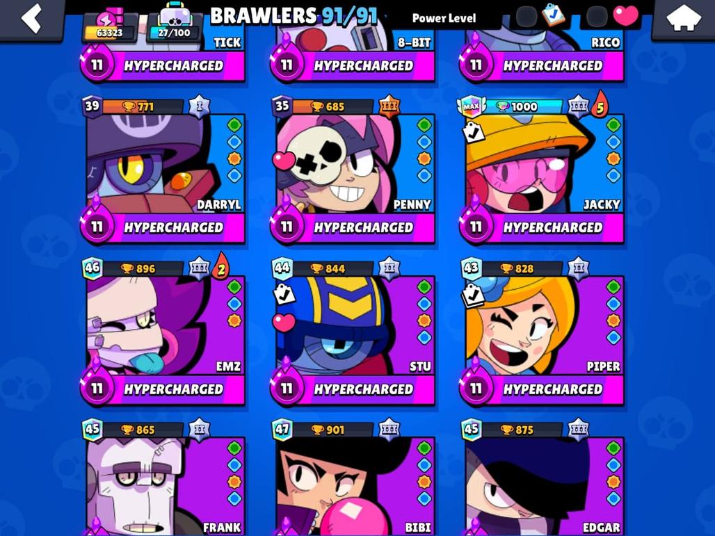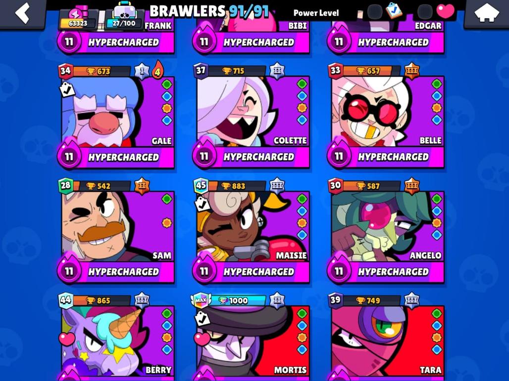 RARE | 63K TROPHIES|91|91 BRAWLERS|48 HYPER CHARGE |36 POWER MAXED| TOTAL 84 MAX| RARE STAR SHELLY SKIN| 150 SKINS|