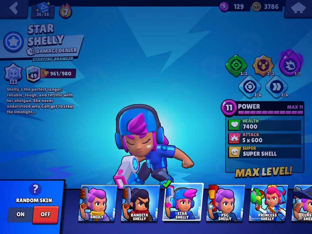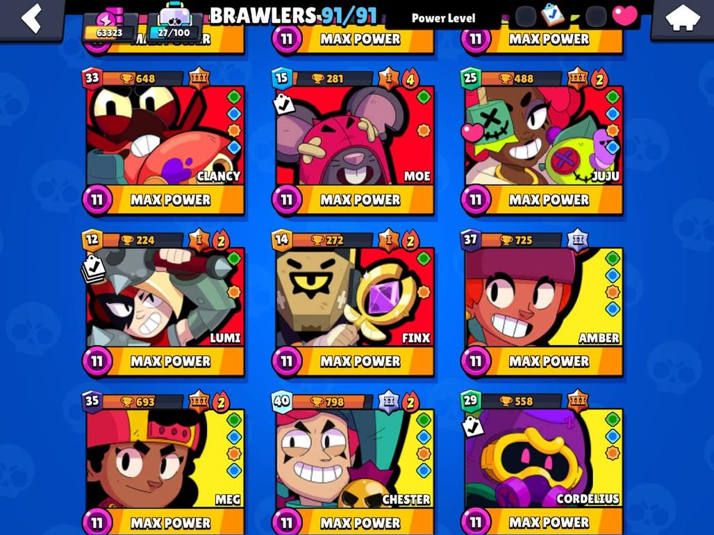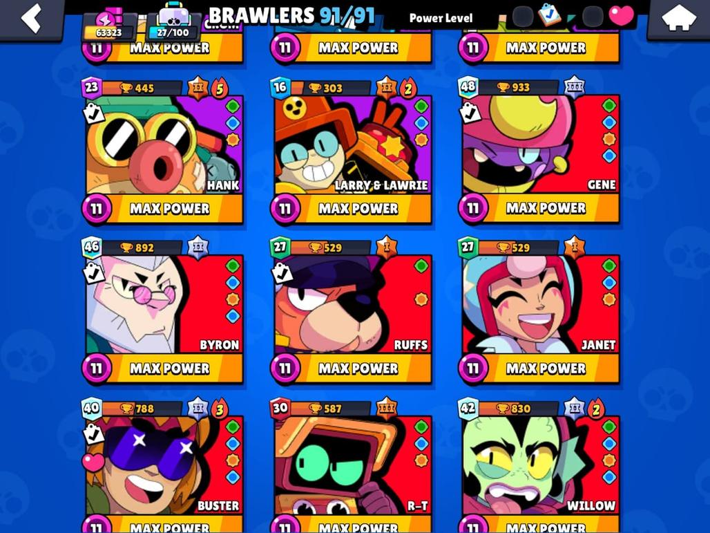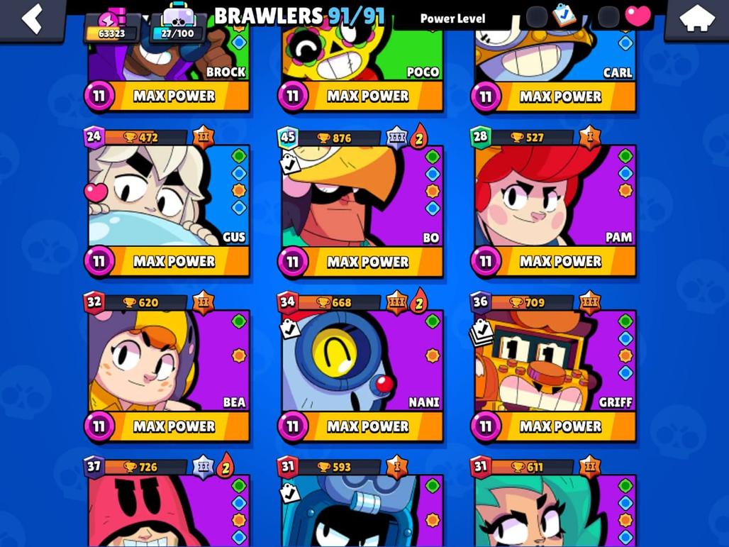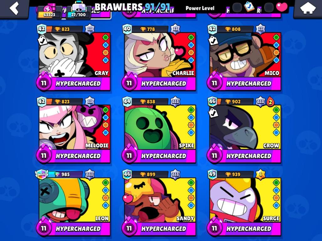 RARE | 63K TROPHIES|91|91 BRAWLERS|48 HYPER CHARGE |36 POWER MAXED| TOTAL 84 MAX| RARE STAR SHELLY SKIN| 150 SKINS|