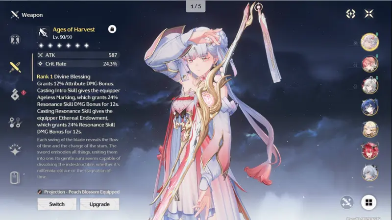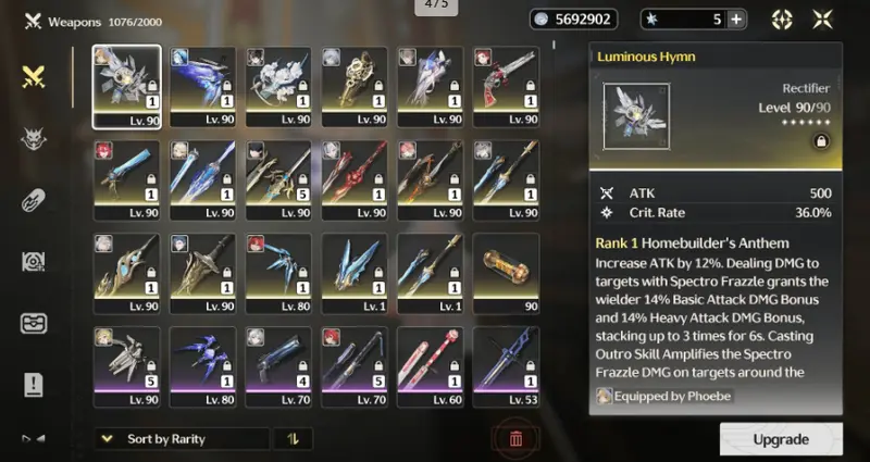 This account is equipped with rare weapons such as Luminous Hymn, The Last Dance, and Ages of Harvest, all at level 90, among numerous other high-level weapons as depicted in the provided images. The Resonator showcase and resonance chains are highly advanced, and all regions have been explored to perfection. Key details include: