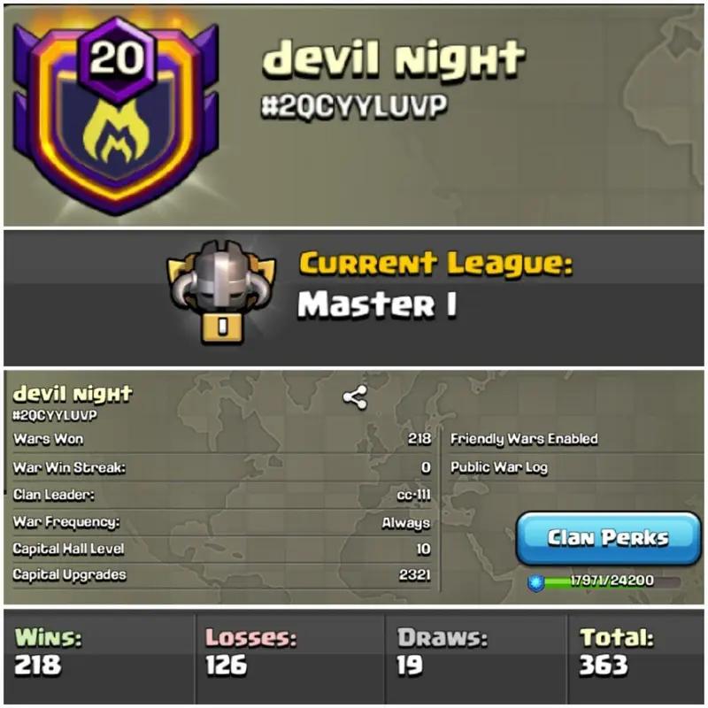 Name - devil night || level 20 clan || clan capital 10 || master 1 || warlog 218-126